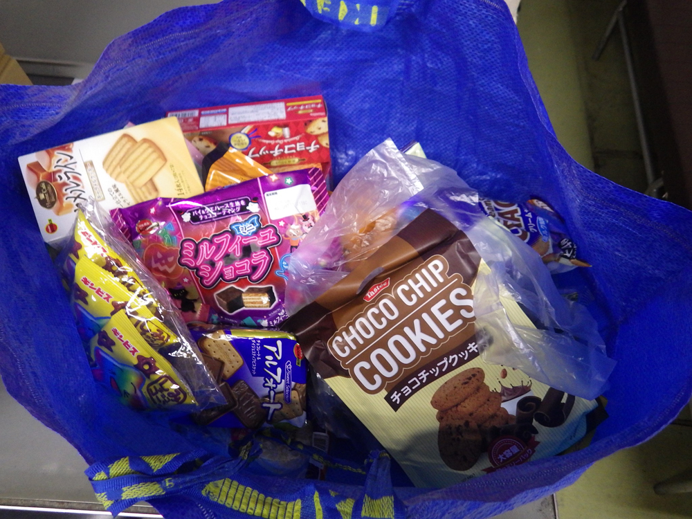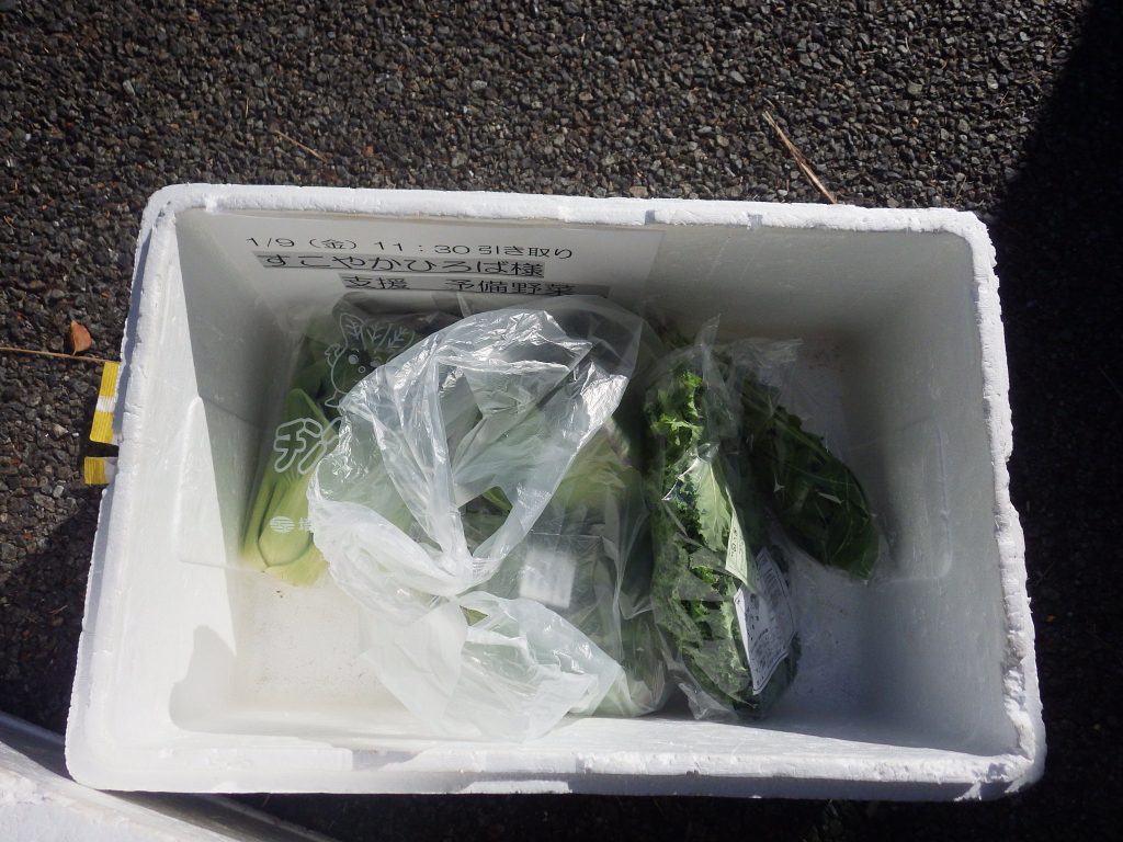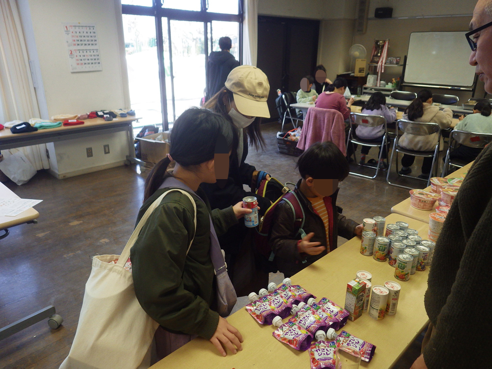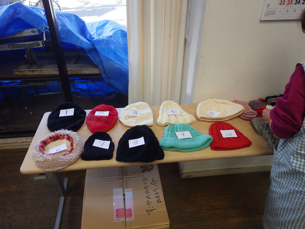 羽衣町にお住いの方が手編みの帽子と靴下を持ってきてくれたので、受付で番号を引いてもらい、引いた番号のものをお渡ししました。